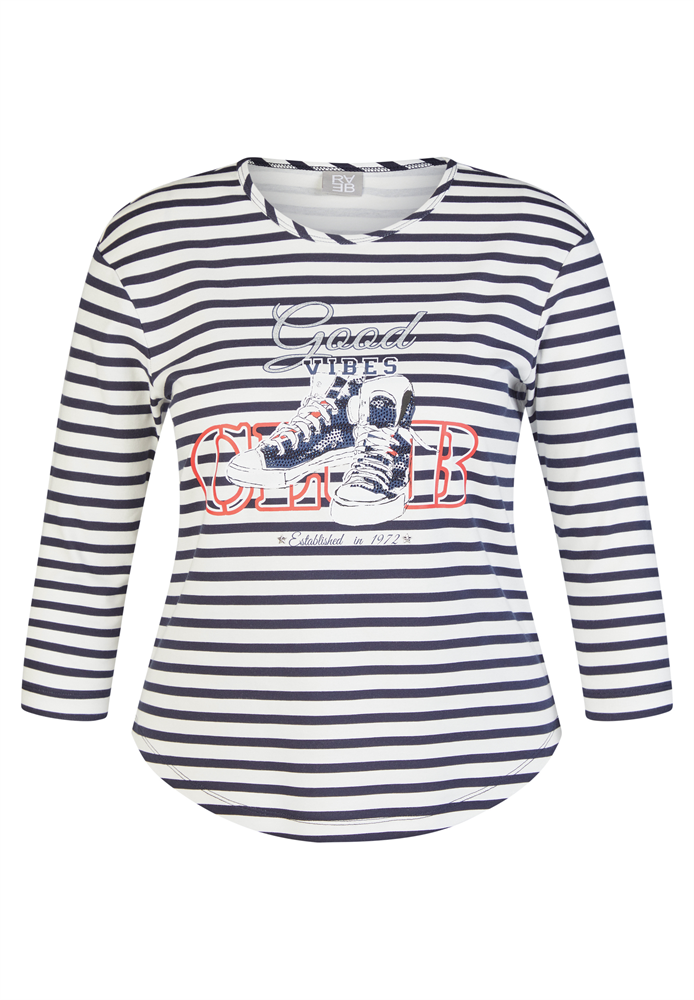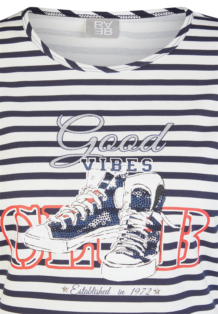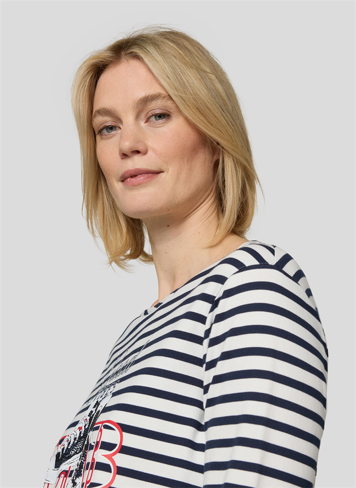 Dieses gestreifte Baumwollshirt überzeugt mit sportivem Flair und kreativen Details. Der Print mit Sneakers und Schriftzügen ist effektvoll mit glänzenden Pailletten und Ziersteinen veredelt. Der weiche Single Jersey sorgt für hohen Tragekomfort. Der feminine Rundhalsausschnitt und die 3/4-Ärmel runden das Design alltagstauglich ab. Ideal zur Jeans oder sportiven Hosen. Reine Baumwolle. Pailletten- und Ziersteinveredelung. Print mit Sneaker-Motiv. 3/4-lange Ärmel. Rundhalsausschnitt.
