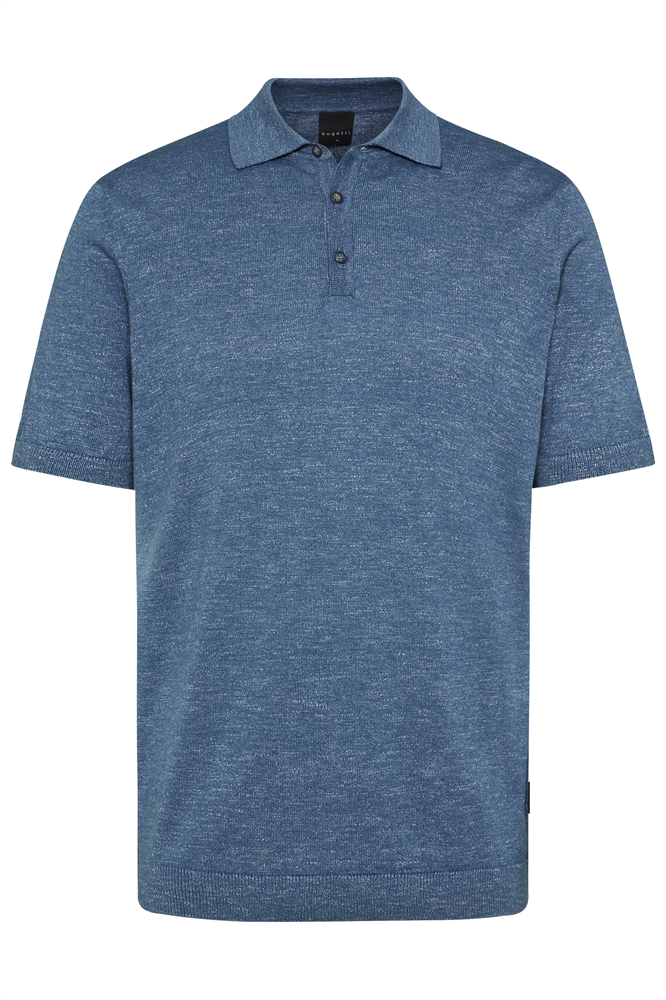 Klassisches halbarm Jaspe Strick-Polo, mit Polokragen, grauen Knöpfen, Ripp-Bündchen am Ärmelabschluß und Saum und bugatti Flaglabel an linker Seitennaht