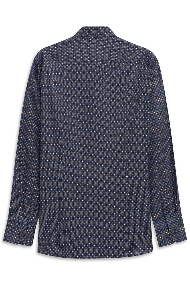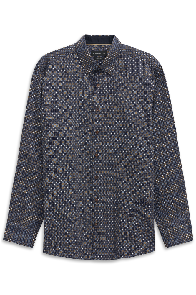 bedrucktes Baumwollhemd, Satin finish, Paspeldetails am Krageninnensteg und an der Knopfleiste, Kontraststoff im Kragen und Manschette, bugatti label in der Seitennaht, Easy Care Finish