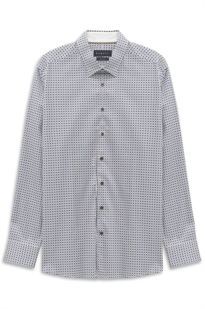Bedrucktes Baumwollhemd, Satin finish, Paspeldetails am Krageninnensteg und an der Knopfleiste, Kontrststoff im Kragen und Manschette, bugatti label in der Seitennaht, Easy Care Finish